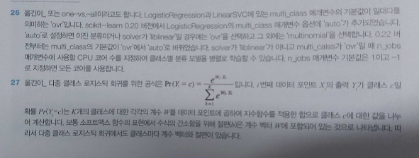 LogisticRegression은 penalty 매개변수에 L1과 L2 규제를 의미하는 'l1', 'l2' 그리고 L1, L2 규제를 모두 사용하는 'elasticnet', 마지막으로 규제를 사용하지 않으려면 'none'으로 지정할 수 있습니다. 사용할 알고리즘을 지정하는 solver 매개변수를 'saga'로 지정하면 모든 패널티를 지정할 수 있습니다. solver 매개변수를 'liblinear'로 지정하면 'l1', 'l2'를 지정할 수 있습니다. 그 외 'newton-cg', 'lbfgs', 'sag'는 'l2'와 'none'만 지원합니다.